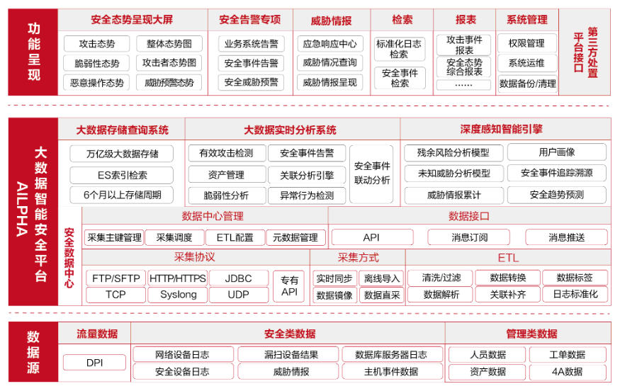 网络安全态势感知服务是通过平台、人工等方式实现对整个网络系统安全能力的感知。平台通过数据采集、共享和接入机制,统筹规划网络安全综合协调指挥业务。它能够提供全天候全方位网络安全监测预警能力、网络安全事件分析能力、网络安全应急指挥联动能力、网络安全信息通过能力、网络安全事件追踪溯源能力等,从攻击、访问、安全、深度威胁四个维度实现整体态势感知,以资产、威胁、攻击、事件、告警的视角提供大数据的分析结果,为研判、决策及保障网络安全提供有效基础支撑。
